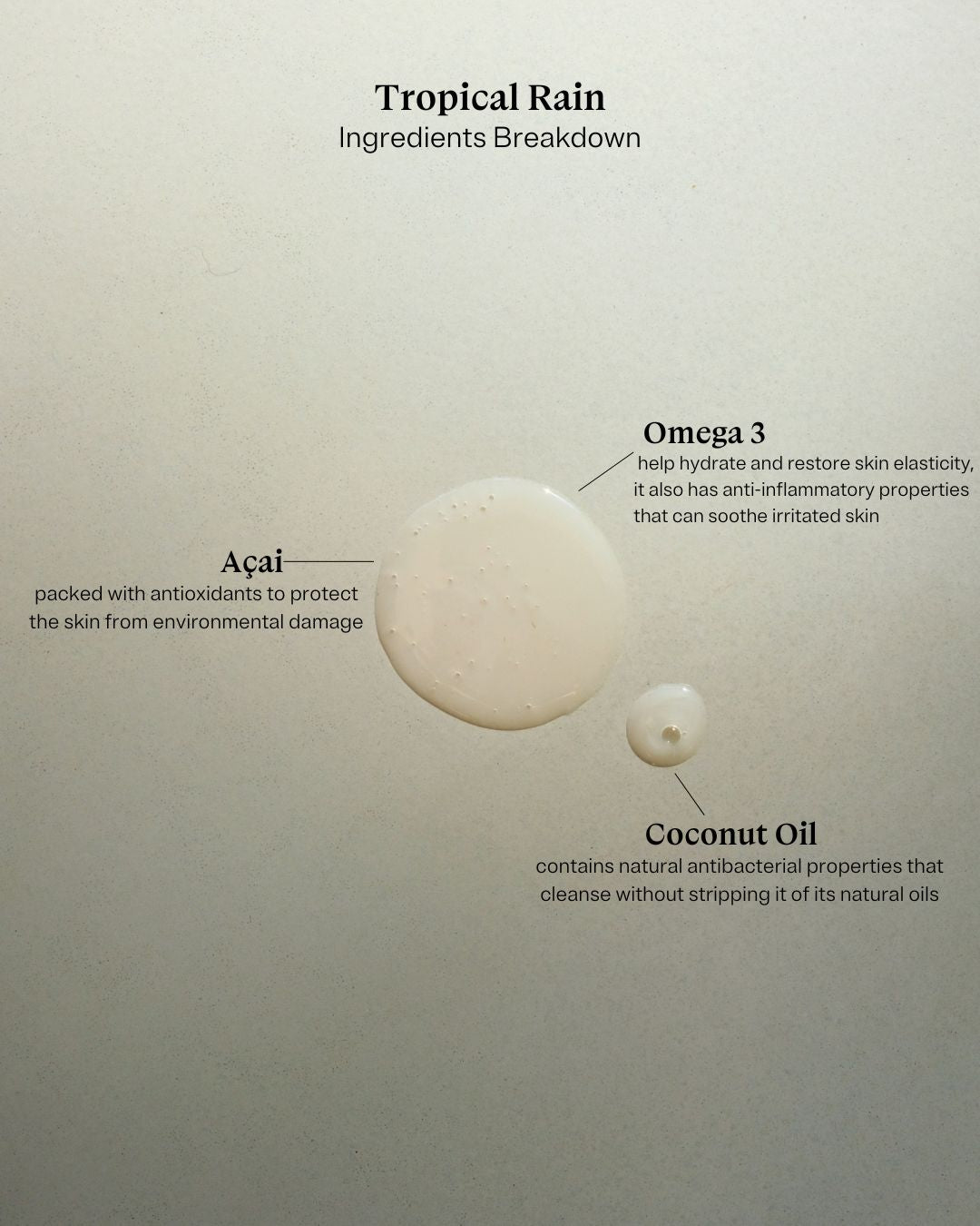 - Açaí: Packed with powerful antioxidants, açaí berry extract protects your skin from environmental stressors while promoting a radiant and youthful appearance. Rich in vitamins and essential fatty acids, it hydrates and revitalizes your skin, leaving it soft, supple, and glowing.